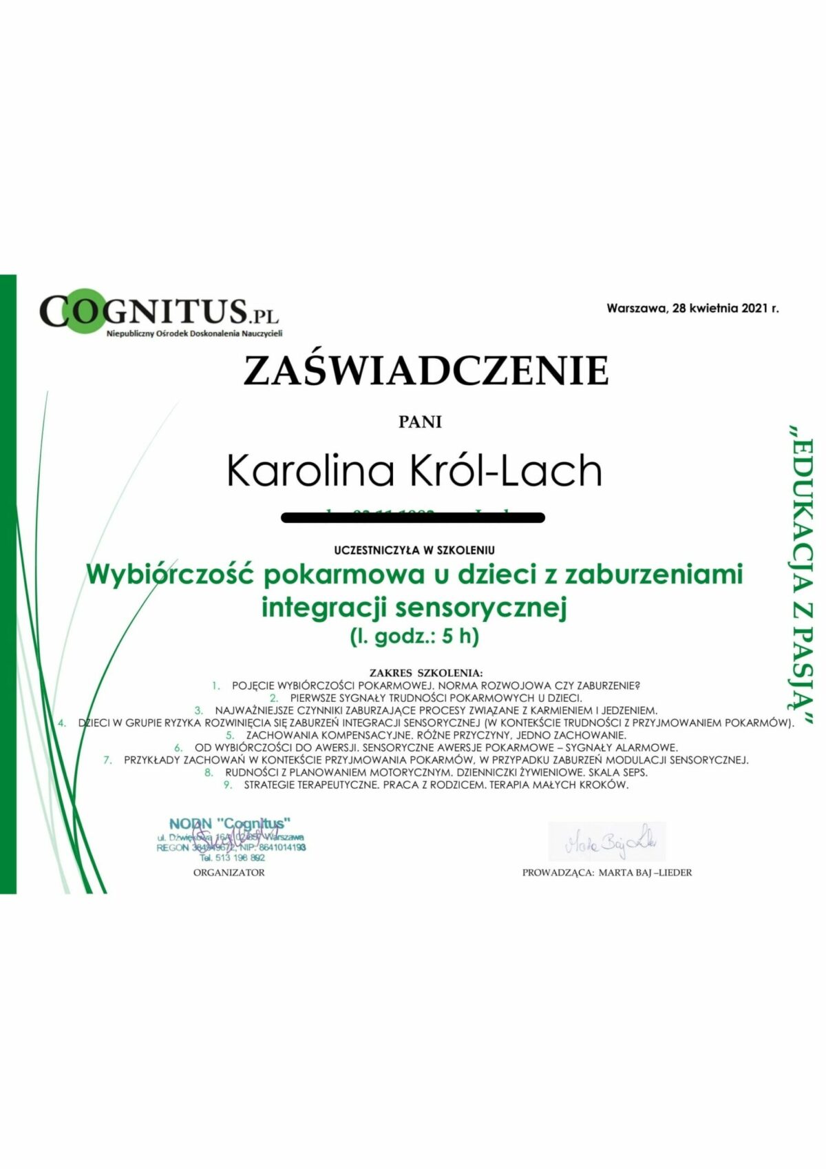 Mikroelement z makrokorzyściami. Rola selenu w codziennej diecie dla zdrowia i dobrego samopoczuciaDiagnostyka i dietoterapia niepłodności kobiecejDiagnostyka i dietoterapia niepłodności męskiejDietoterapia w PCOSŻywienie w onkologiiEndometrioza – dieta, diagnostyka i suplementacjaŻywienie kobiet w ciąży i kpLeczenie żywieniowe w onkologiiNietolerancja histaminyPMS – dieta i suplementacjaDyplom ukończenia studiówDyplom uznaniaBilansowanie diet wegetariańskichPsychologia dla dietetykaRacjonalne odchudzanie